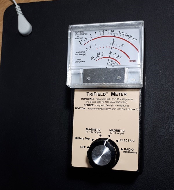 If you’re wondering why my body is humming away with almost 5V going through it when I’m not in contact with the Universal Earthing Mat, a quick measure of the magnetic field should explain things. Using my old trusty Trifield meter, set to the 0-3 milligauss Magnetic field range, and placing it where my hand sits on the earthing mat, the meter reads 2.0 milligauss, as shown in the picture below. That may not seem like much, but there’s more to the story…