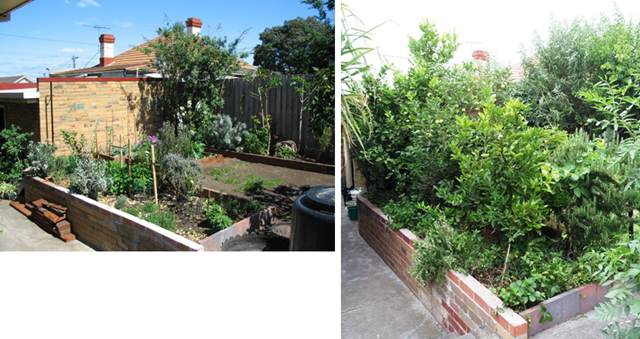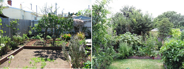 The before and after photographs in this article were taken at the very beginning when I first finished planting up my urban backyard food forest, and then approximately three to four years later. Each pair of photographs was taken from roughly the same view point, so the same garden beds are visible, to shown the garden’s growth over time.
