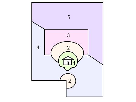 The areas around a house are divided up into zones numbered 0 to 5, based their accessibility and frequency of use in relation to the location of the house. The lowest number denotes the most frequently accessed areas, while the highest number indicates the areas least accessed.