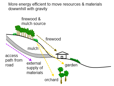 Growing timber for firewood or plants for mulch uphill from the house makes it easier to bring the material back to where it will be used because the load is carried downhill.