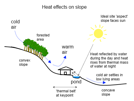 Similarly, we can place plantings of tall trees on a slope to retain heat, to warm the incoming cold night air that flows down the slope. When the warm air moves through the forested area, it will have warmed up as much as it can, and on reaching a plateau at the end of the forest, all the warm air will begin to rise, creating a thermal belt, which will be warmer than the surrounding area. If we place a house in this thermal belt, it will be warmed naturally.